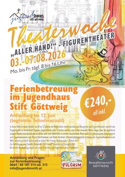 22 Kinder zwischen 8 und 12 Jahren nahmen von 4. bis 8. August an der Theaterwoche im Jugendhaus teil! Kinder, Klima und unser Wald! Das waren die Zutaten für unsere heurige Theaterwoche! Wir verkleideten uns, hatte kreative Ideen für das Bühnenbild, diese setzten wir auch tatkräftig um! Wir reisten und  wir verreisten! Wir machten uns auf zu einer Fanatsiereise, im Brunnensaal des Stiftes , es hieß Bühne frei für  unsere kleinen Künsterinnen und Künstler! Die Begeisterung des Publikums mit Eltern , Geschwistern und Verwandten hörte man am großen Applaus wo bei auch dann eine Zugabe - ein Tanz -  der Stars geboten wurde! Das Jugendhaus feiert heuer seinen 20. Geburtstag unter diesem Motto fand auch diese Kinderbetreuungswoche statt: Spiel, Spaß und ein gutes, gemeinsames Miteinander.